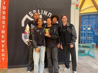 Prizes were awarded by the alderman, with an extra surprise: the Paper Dome itself received the award for the best sports facility in Zuidoost. The team of young people—Leijn, Jamie, Jaccot, Ravalie, and Jango—accepted the prize with pride and highlighted in their speeches how important the Paper Dome is for the community.